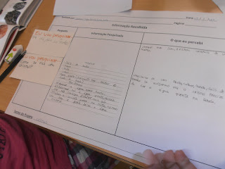 Este ano temos um novo registo. Cada um dos meninos ficou responsável por pesquisar uma das perguntas feitas pelo grupo. Numa das colunas colamos a pergunta feita, na segunda coluna colamos a informação que recolhemos e na terceira coluna colocamos por tópicos e por palavras nossas aquilo que percebemos da informação lida.